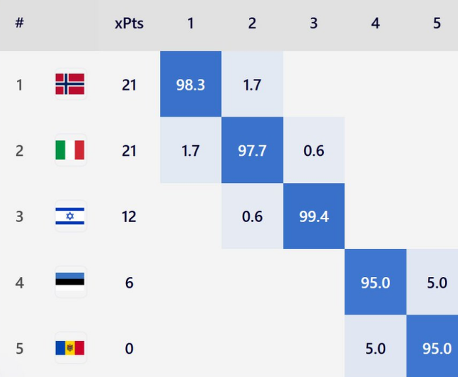 Statisticienii de la Football Meets Data estimează că Norvegia are 98% șanse să câștige grupa. În prezent, scandinavii sunt cu 6 puncte peste Italia, echipă pe care au învins-o cu 3-0 la Oslo.