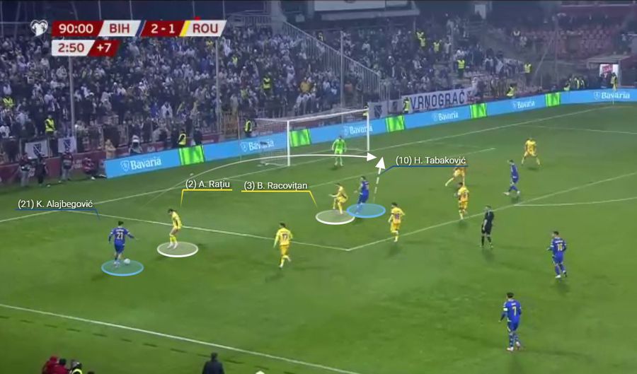Pentru fazele fixe, s-a plasat constant în ofsaid, având rolul de a aglomera zona. În ultimele minute ale primei reprize, România a încercat să temporizeze, o tactică dorită de Lucescu, dar care nu a dat rezultate și ne-a costat puncte. Auturile executate de Chipciu au câștigat câteva momente prețioase, iar posesia direcționată spre portar a temperat elanul bosniac.