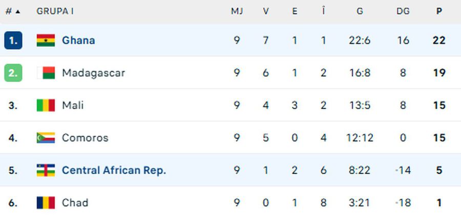 Echipa ghaneză este aproape calificată la turneul final din 2026, deși nu a obținut încă biletele din punct de vedere matematic. Cu o etapă înainte de final, Ghana are 3 puncte avans față de Madagascar, echipa de pe locul 2, și o diferență de +8 la golaveraj.