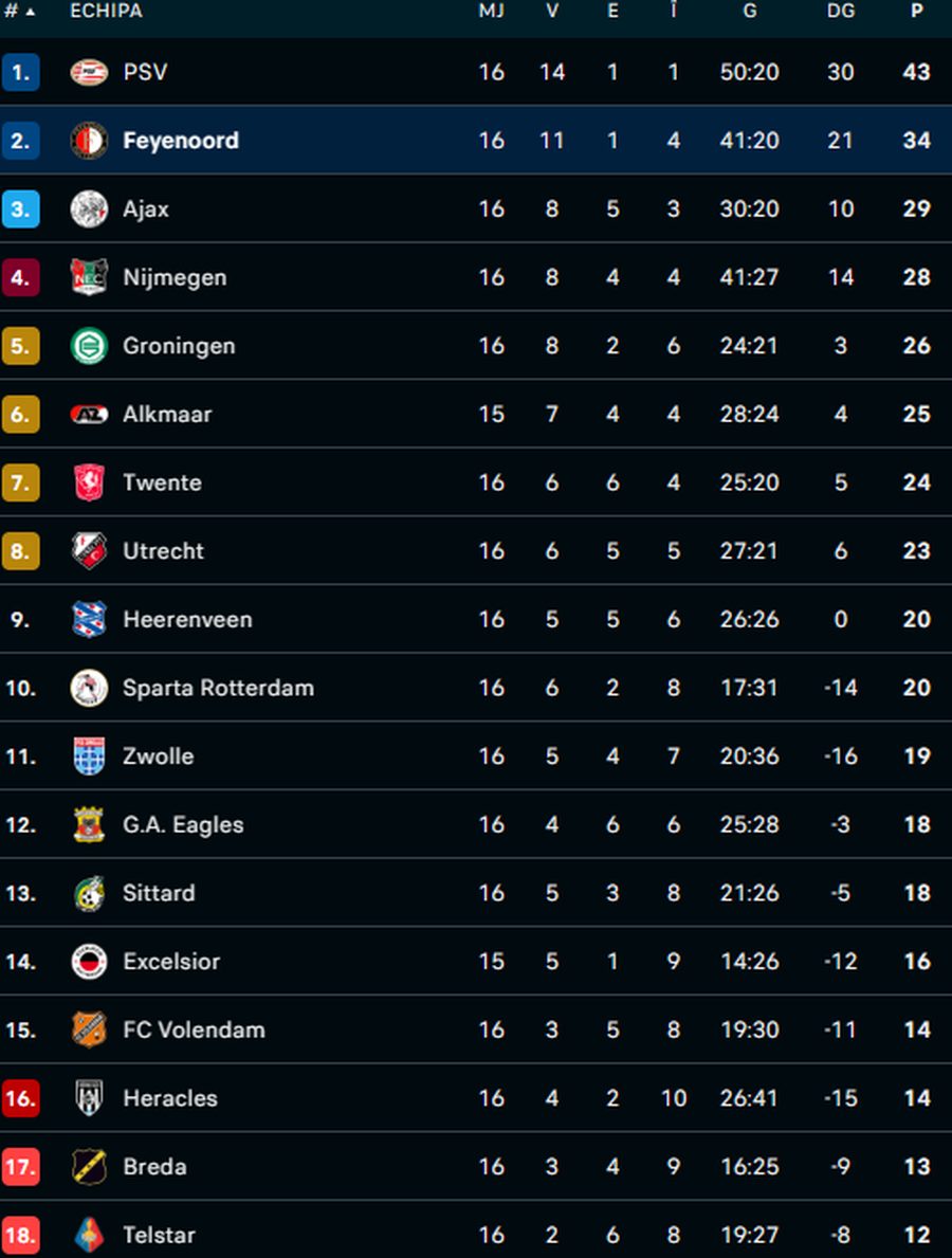 În urma acestui rezultat, echipa se află pe locul 2, cu 9 puncte în urmă față de liderul PSV.