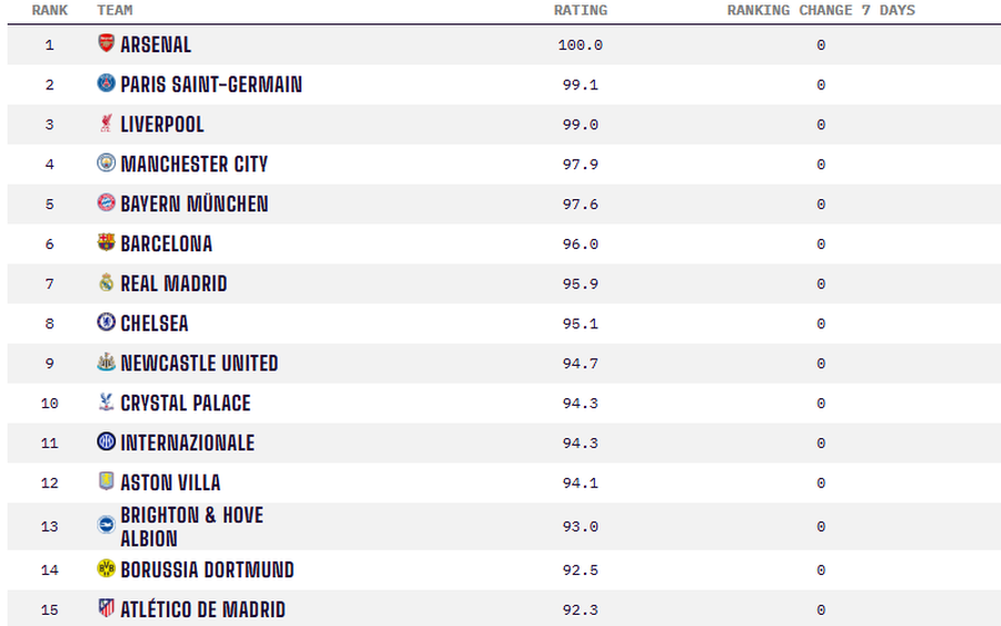 Acel Power Ranking reprezintă un sistem de evaluare a echipelor, pe o scară de la 0 la 100, unde cea mai slabă echipă primește zero, iar cea mai bună 100. Arsenal are un scor de 100, urmată de PSG (99,1) și Liverpool (99).
