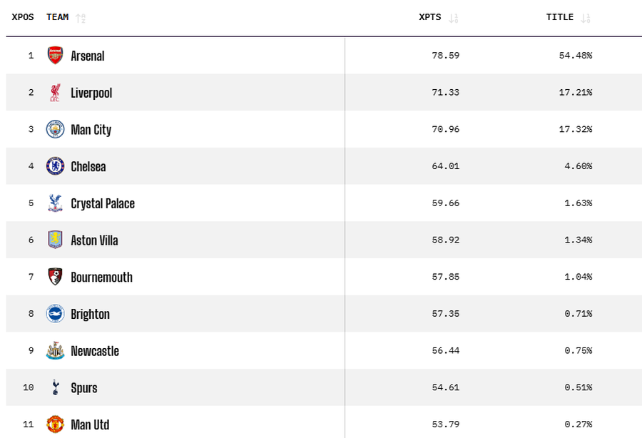 Supercomputerul estimează că Arsenal va obține în jur de 79 de puncte în acest sezon (media simulărilor este de 78,59), mult peste Liverpool (71,33) și Manchester City (70,96). Interesant este că, deși Liverpool acumulează mai multe puncte în medie decât City, „cetățenii” termină pe primul loc în mai multe simulări.