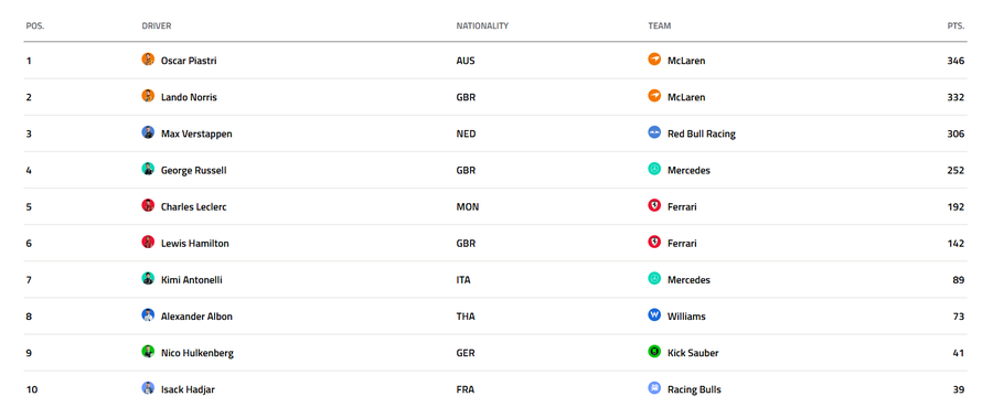 În prezent, Verstappen ocupă locul trei în clasament, având 306 puncte, și trebuie să recupereze 40 de puncte pentru a ajunge la nivelul liderului, Oscar Piastri, care are 332 de puncte.
