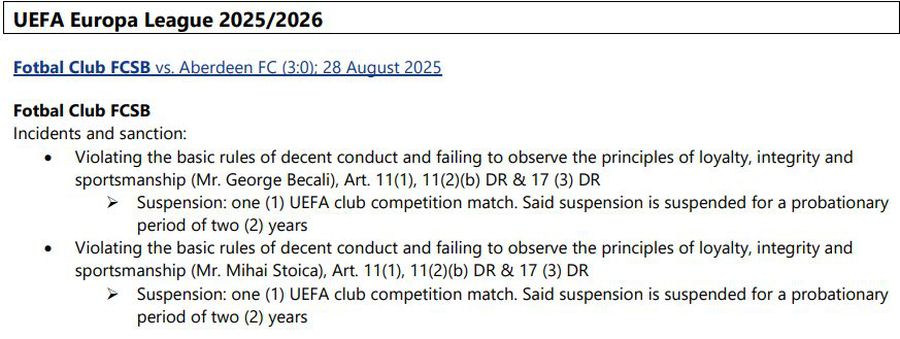 Comisia de disciplină a UEFA a anunțat sancțiuni pentru Gigi Becali (67 de ani), proprietarul FCSB, și pentru Mihai Stoica (60 de ani), președintele Consiliului de Administrație al clubului. Aceștia au fost penalizați pentru „încălcarea regulilor fundamentale de conduită decentă și nerespectarea principiilor de loialitate, integritate și spirit sportiv”, în urma meciului din preliminariile Europa League cu Aberdeen, câștigat pe Arena Națională cu 3-0 pe 28 august.