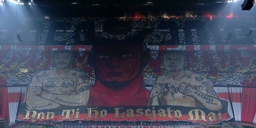 Scenografie în Curva Sud a tifosilor rossoneri într-un derby Inter – AC Milan