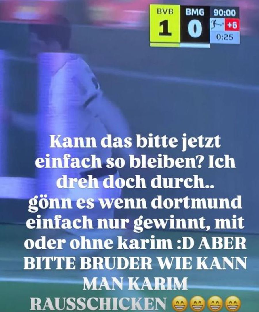 Într-un „insta-story”, artista de 28 de ani a partajat o fotografie din timpul meciului, în momentul în care Dortmund conducea cu 1-0, exprimându-și dorința ca „galben-negrii” să câștige, indiferent de prezența lui Adeyemi pe teren. De asemenea, a adresat un mesaj direct lui Niko Kovac: „Se poate, vă rog, ca meciul să se termine așa? Înnebunesc… Mă bucur dacă Dortmund câștigă, cu sau fără Karim. DAR SINCER, FRATE, CUM POȚI SĂ-L SCOȚI AFARĂ PE KARIM?”.