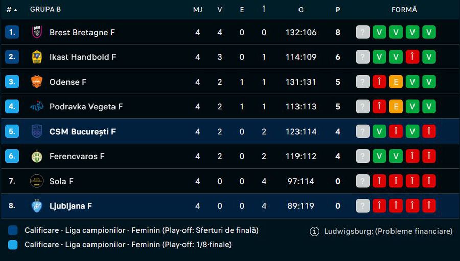 În urma primelor 4 etape din Liga Campionilor, CSM București ocupă locul 5 în grupă, cu 4 puncte acumulate din 2 victorii.
