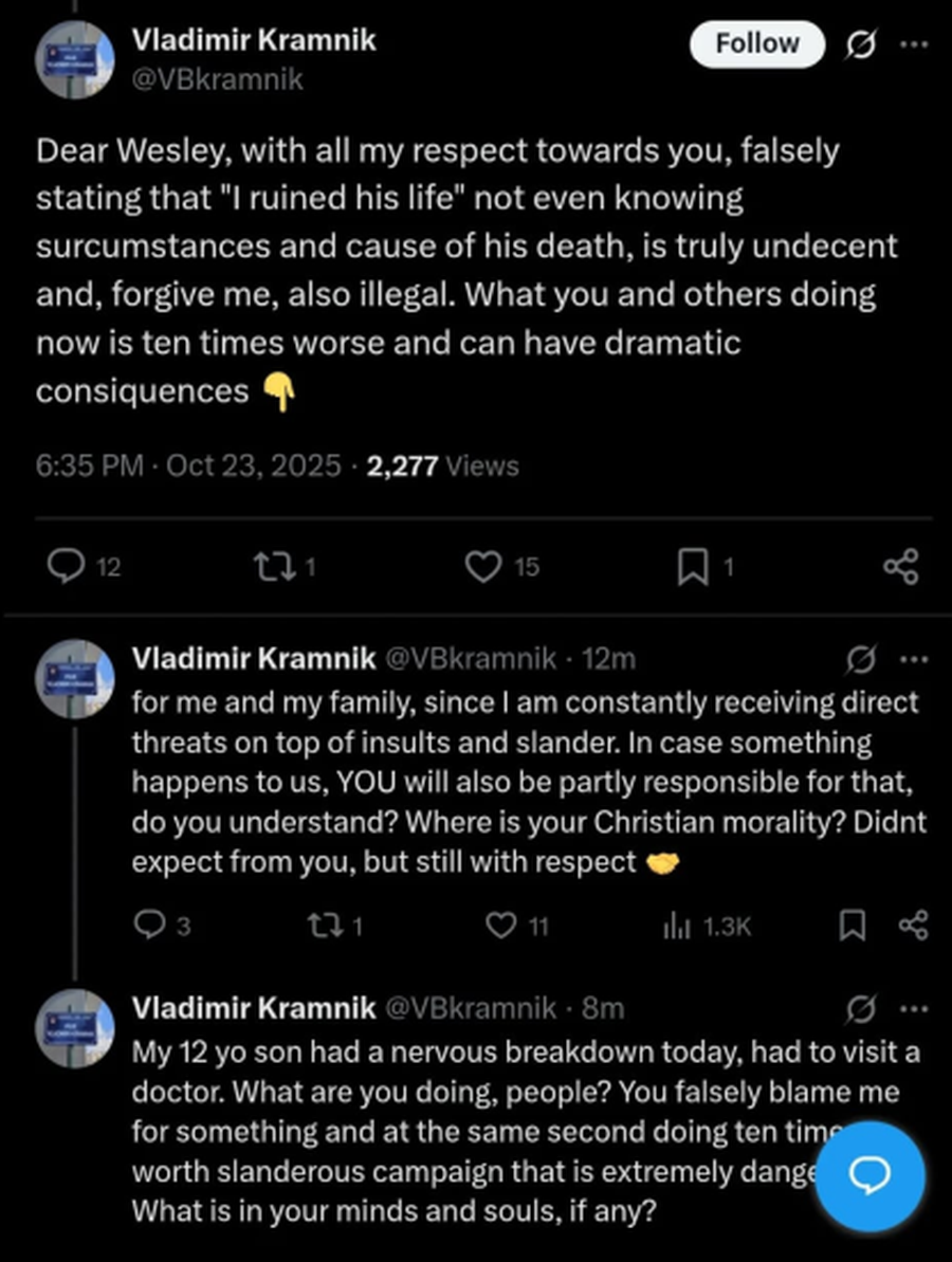 „Draga Wesley, cu tot respectul pentru tine, să afirmi că i-am distrus viața, fără să cunoști circumstanțele sau cauza decesului său, este indecent și ilegal. Comportamentul vostru este de zece ori mai grav și poate avea consecințe severe pentru mine și familia mea, având în vedere că primesc constant amenințări și insulte. Dacă ni se întâmplă ceva, tu vei avea și o parte din responsabilitate, înțelegi? Unde este moralitatea ta? Nu mă așteptam la asta din partea ta, totuși îți vorbesc cu respect. Fiul meu de 12 ani a avut o cădere nervoasă și a trebuit să meargă la medic. Ce faceți, oameni buni? Mă acuzați pe nedrept și în același timp desfășurați o campanie calomnioasă despre care nu aveți idee. Cu ce gânduri ați venit aici?”