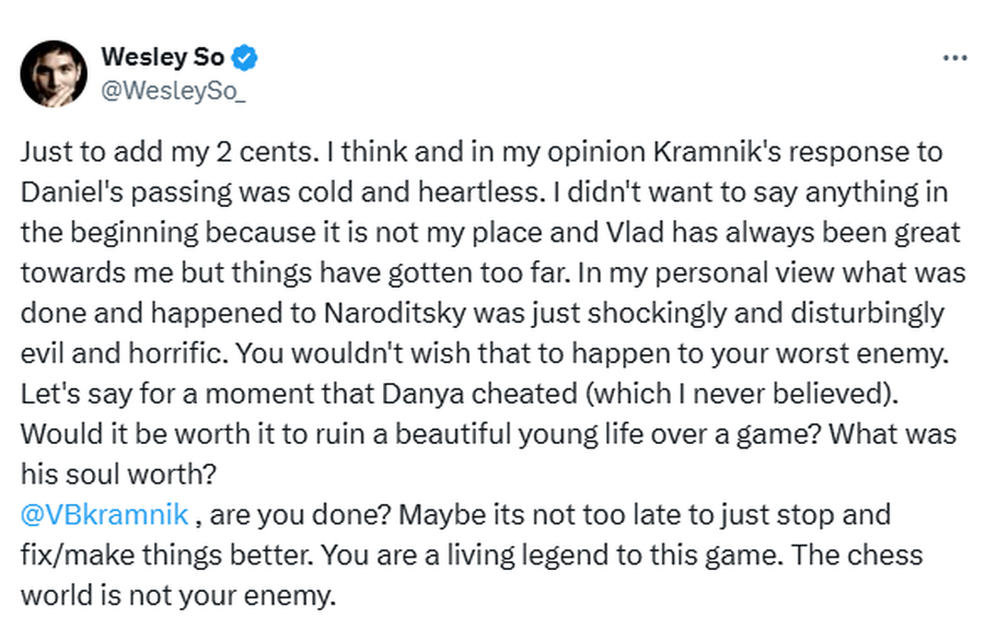 „Consider că reacția lui Kramnik la moartea lui Daniel a fost rece și lipsită de compasiune. Nu am vrut să intervin la început, deoarece nu eram în măsură să comentez, iar Vlad a fost întotdeauna respectuos cu mine, dar comportamentul lui a depășit limitele. Ceea ce s-a întâmplat cu Naroditsky este pur și simplu șocant și tragic. Nimeni nu ar trebui să experimenteze așa ceva. Chiar dacă s-ar dovedi că Danya a trișat (ceea ce eu nu am crezut), cum poate cineva să distrugă viața unui tânăr pentru un joc? Cât valorează sufletul său? Kramnik, este timpul să te oprești. Ai ocazia să schimbi lucrurile, ești o legendă vie a acestui joc. Lumea șahului nu este dușmanul tău.”