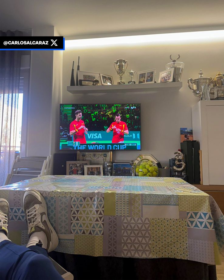 În fotografie se pot vedea doar picioarele lui, odihnindu-se pe masa din sufragerie, acoperită cu o mușama, material impermeabil care este mai frecvent în gospodăriile rurale din 2025. Deasupra televizorului, Alcaraz își expune trofeele de prestigiu.