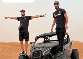 Stoperul a fost surprins într-o fotografie realizată în deșert, alături de un prieten, stând pe o mașină de teren specială pentru astfel de condiții.